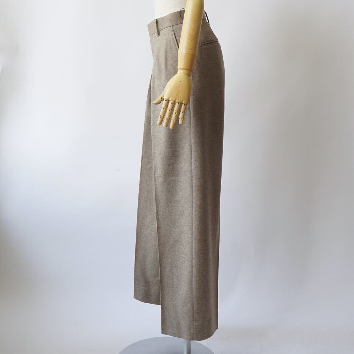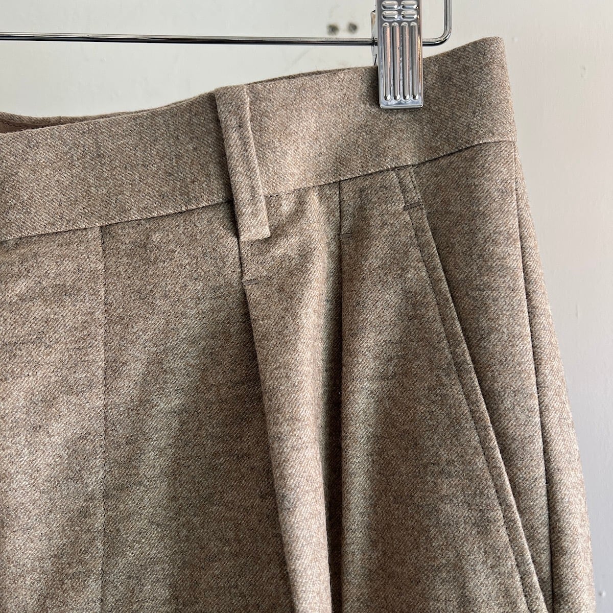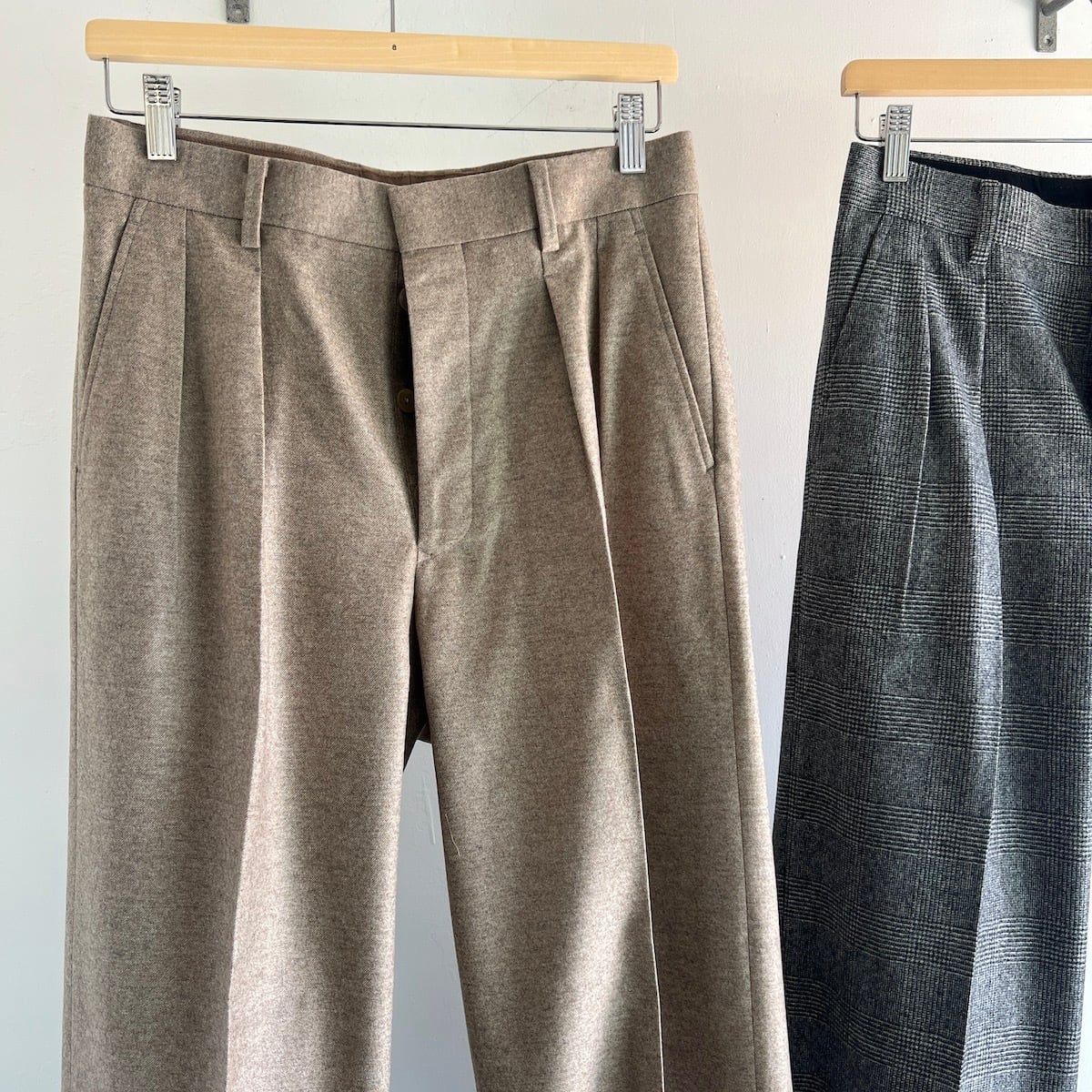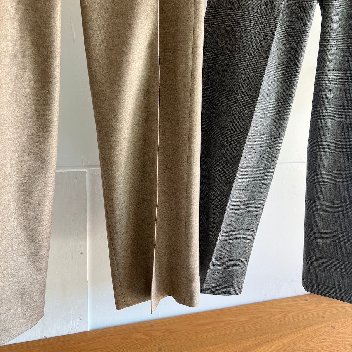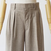 縦糸にカシミヤ混の太い糸を高密度に打ち込む事で適度なハリとコシがありながらもカシミヤのウォーム感と光沢を感じるシャープなフラノ素材を採用した2タックテーパードシルエットのトラウザー。