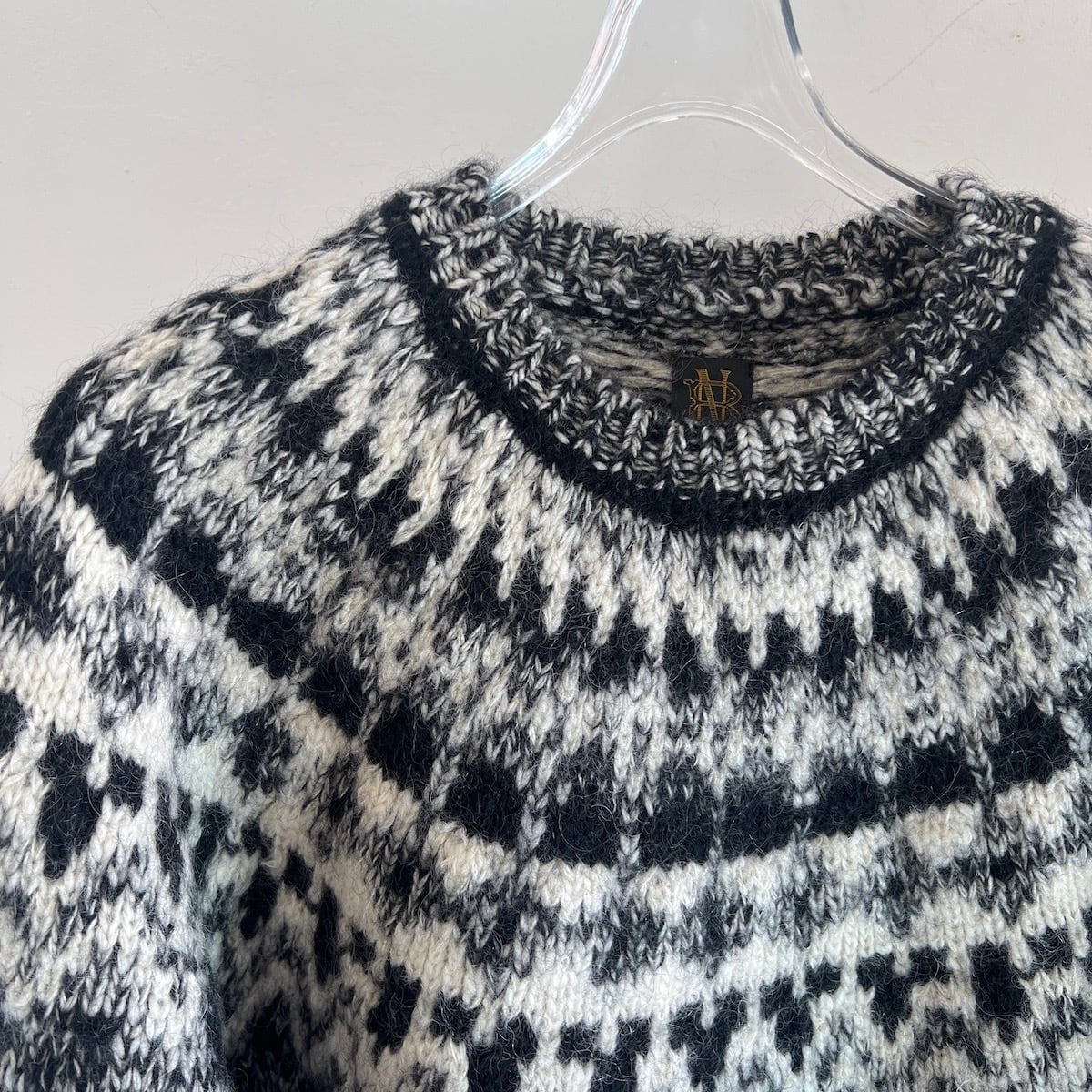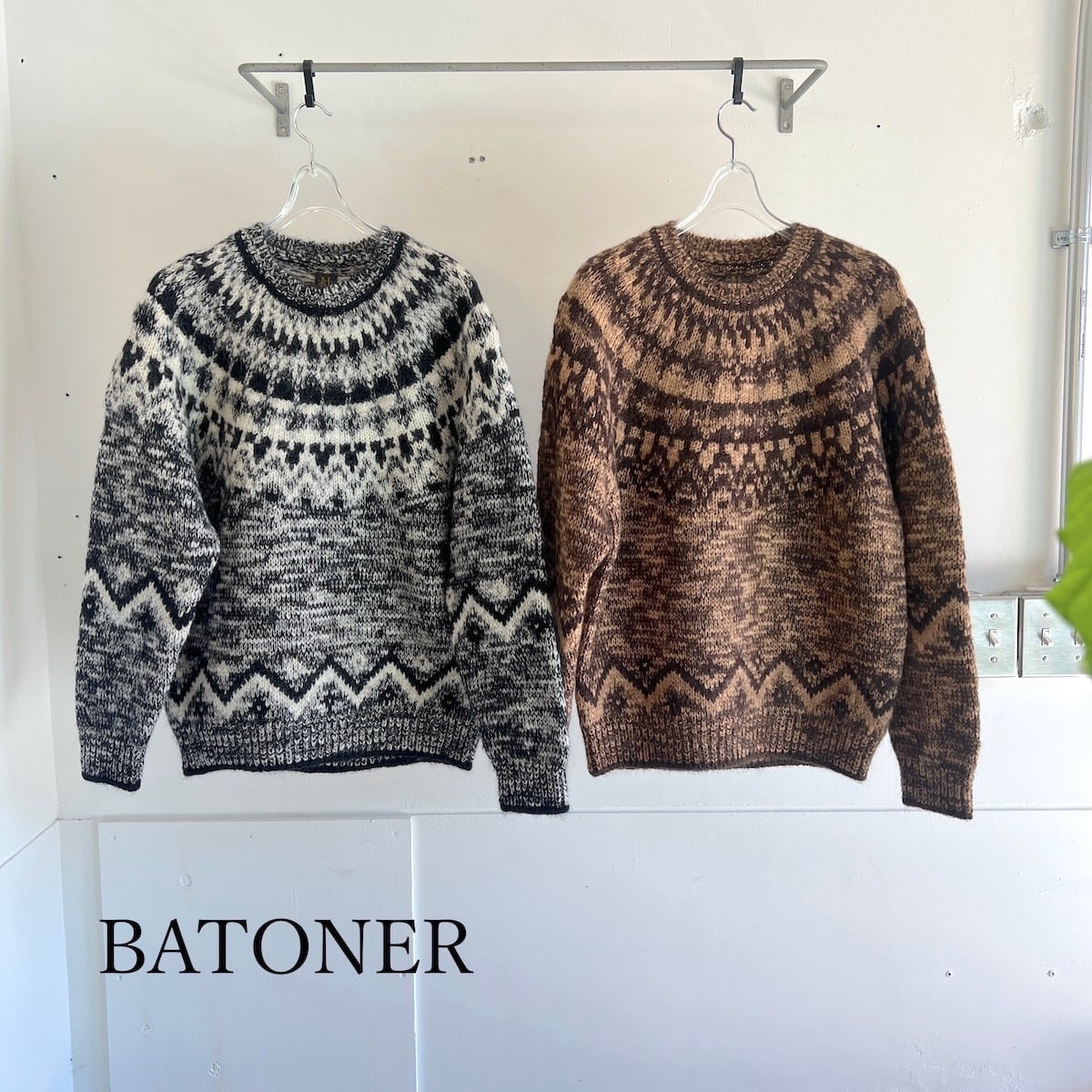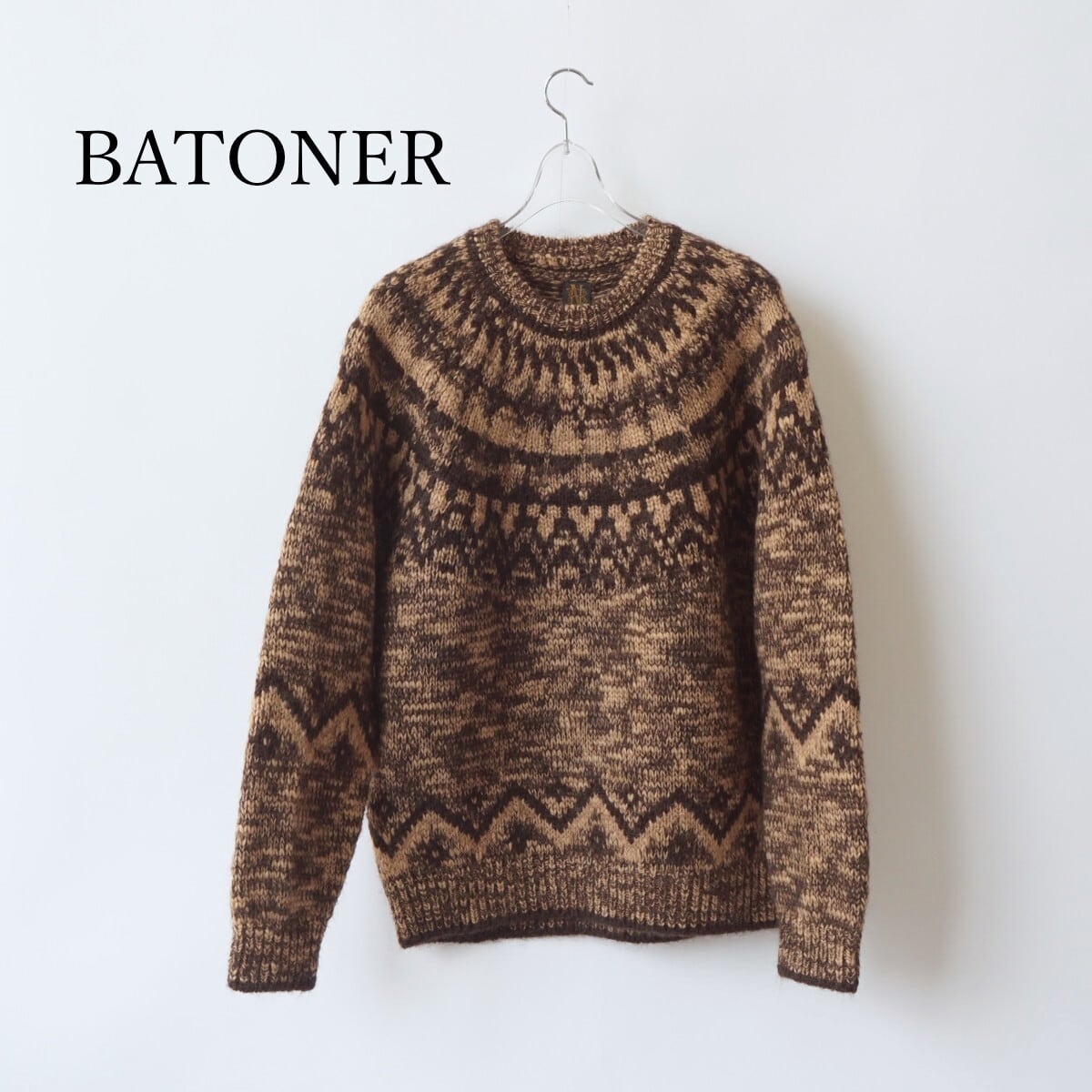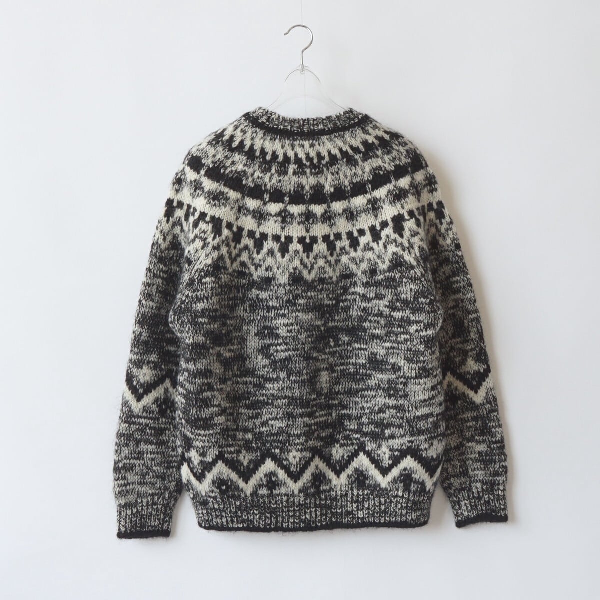 モヘヤ・アルパカ・ウールの天然素材のみをブレンドした糸に。太番手のスラブヤーンをミックスして編み立てています。