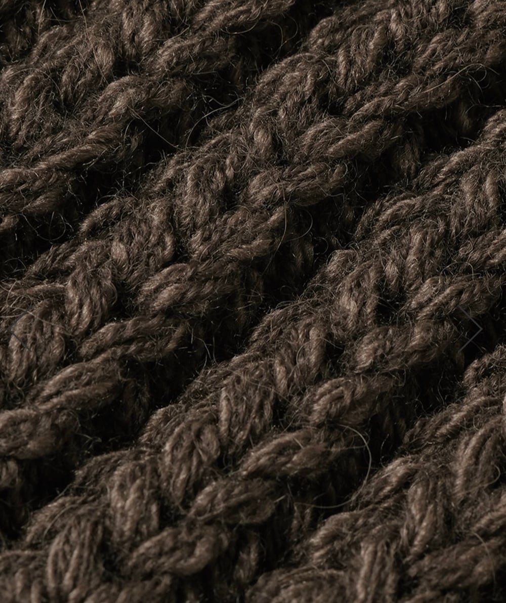 膨らみの強い太番手の紡績したメリノウールに、柔らかく優しい肌触りのベビーアルパカと光沢感のあるシルクをブレンドした糸を使用。