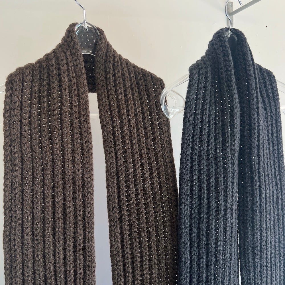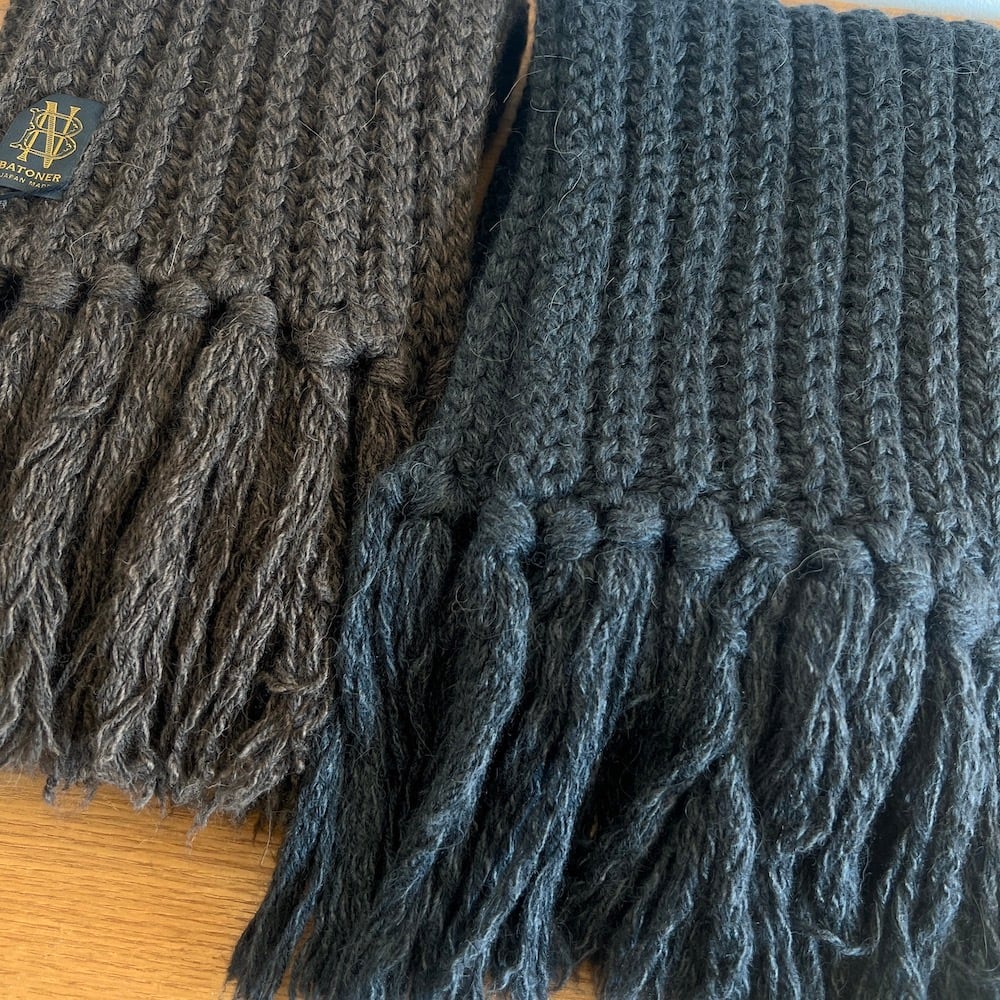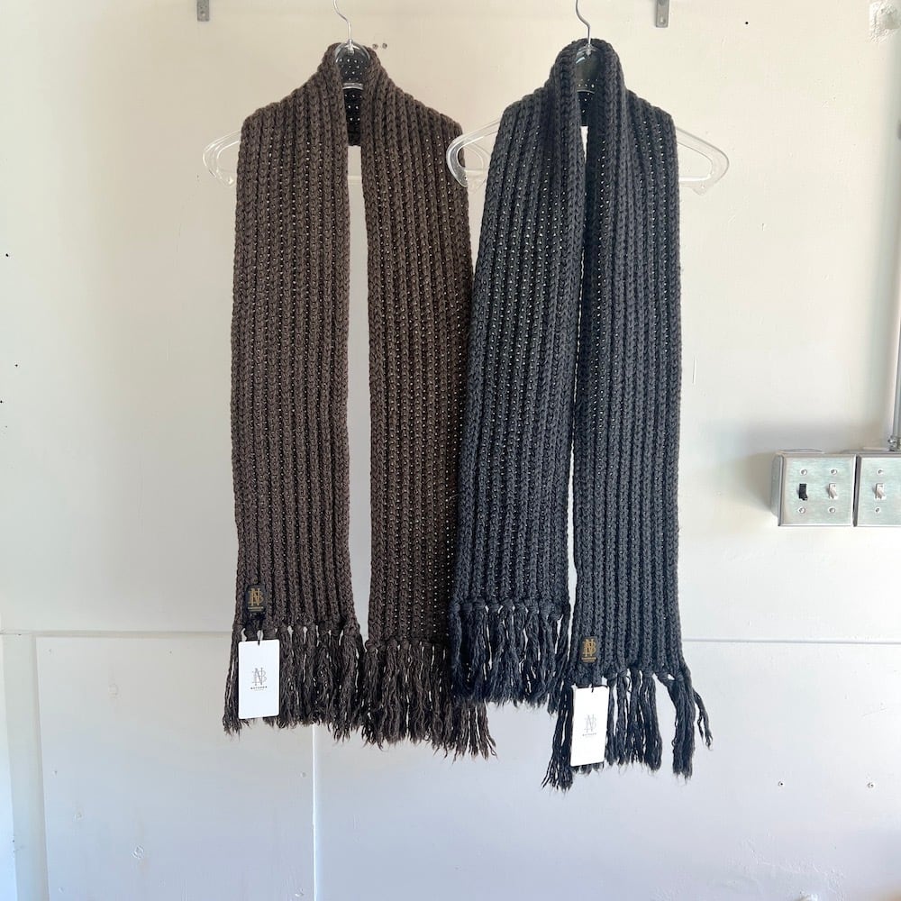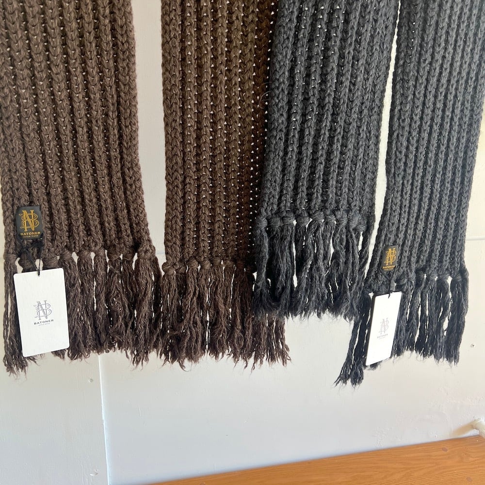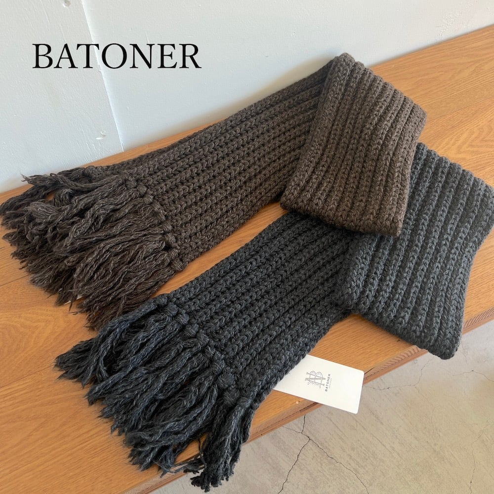 ローゲージでふっくらと編立てたBATONER定番のフリンジマフラー。