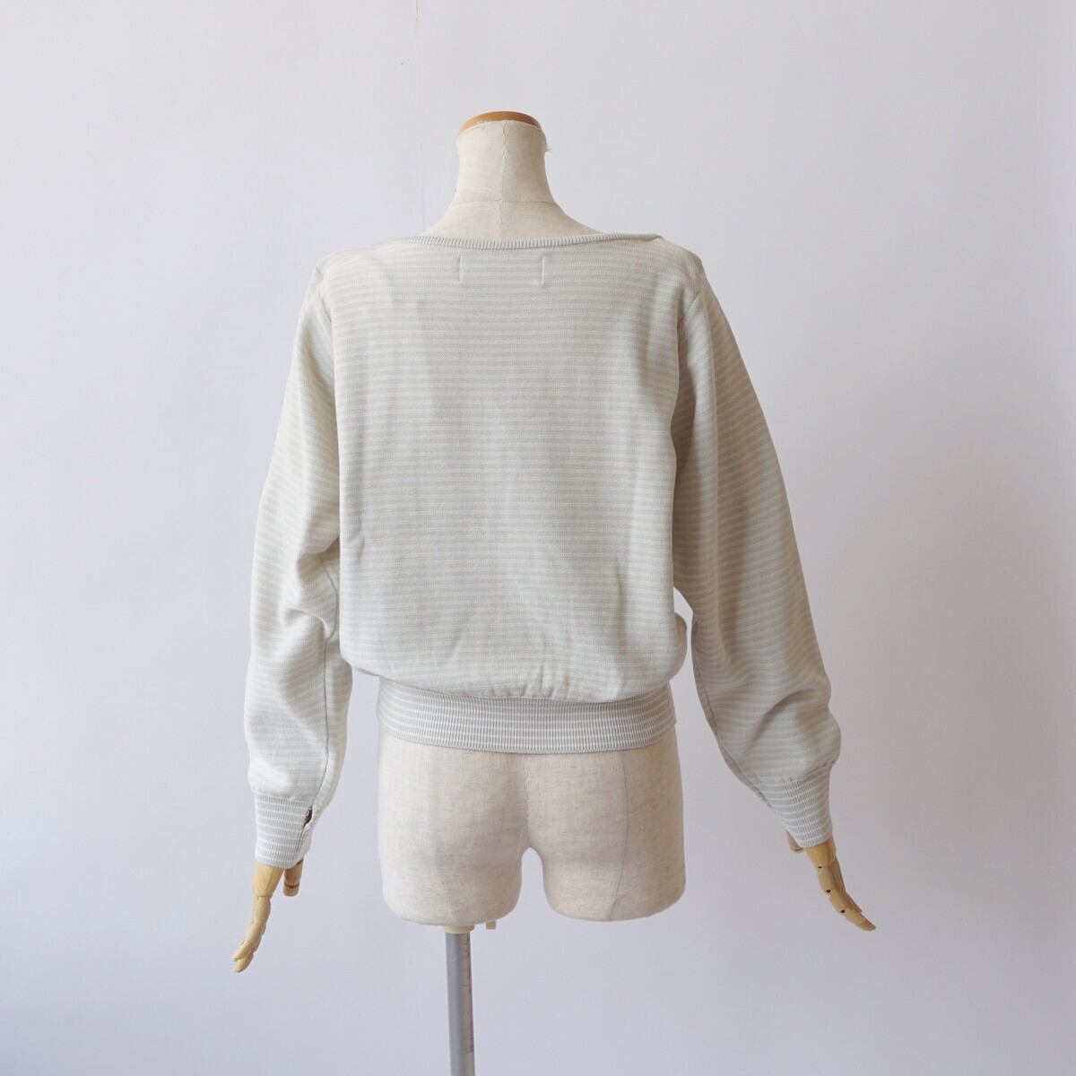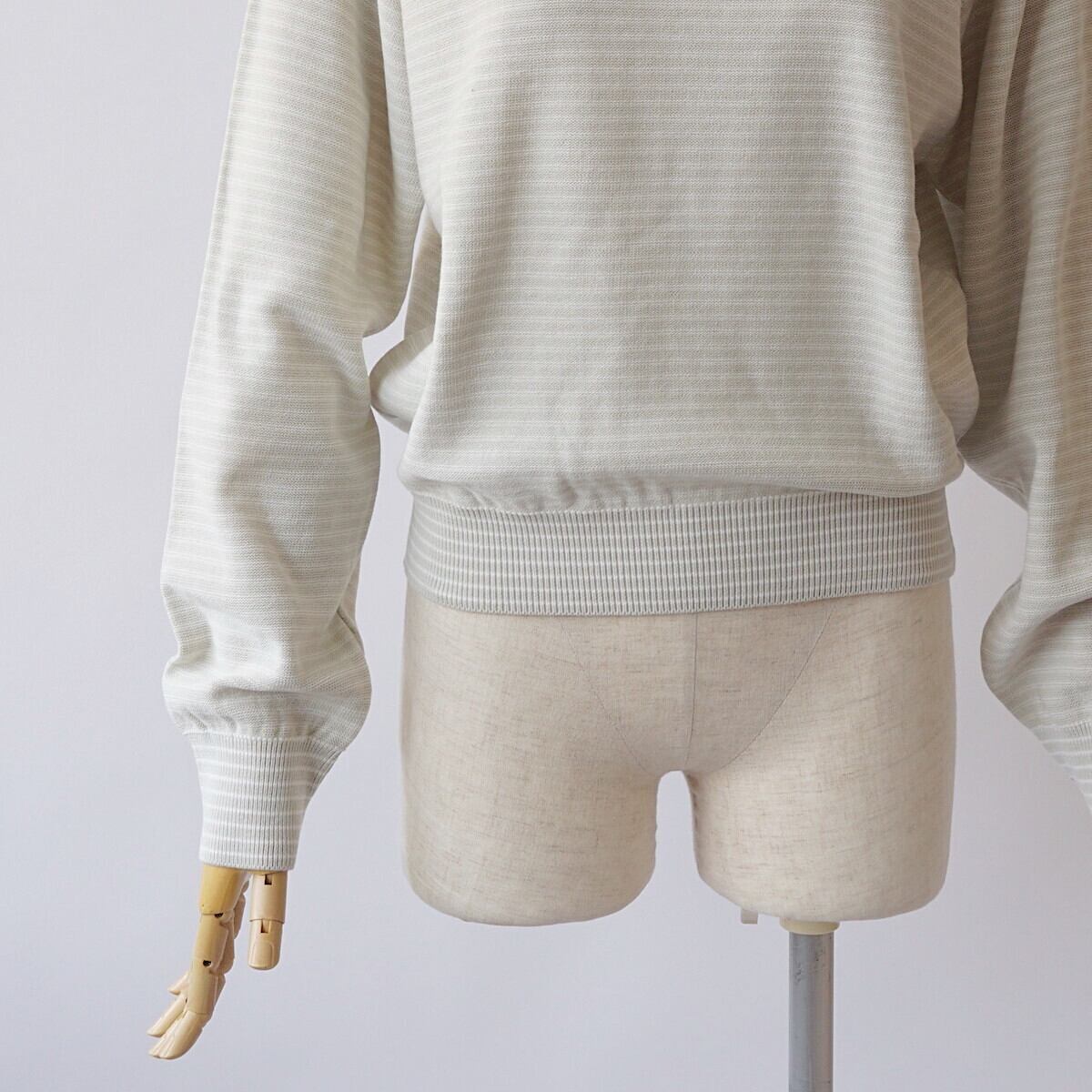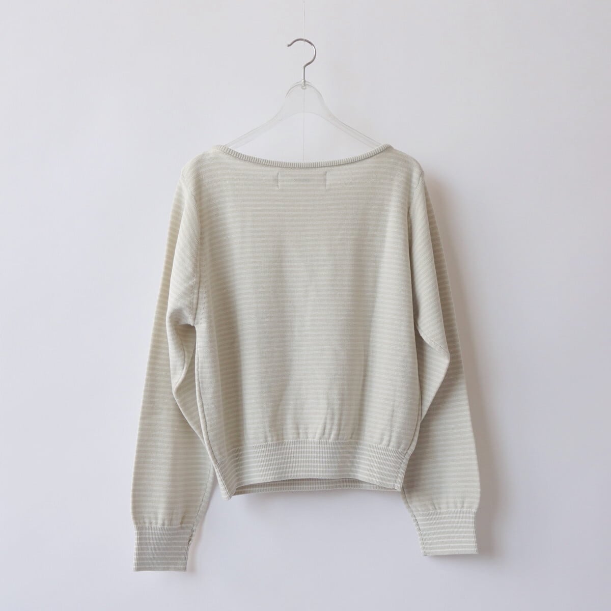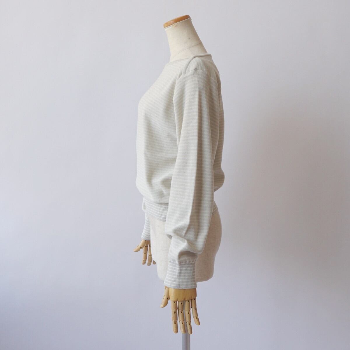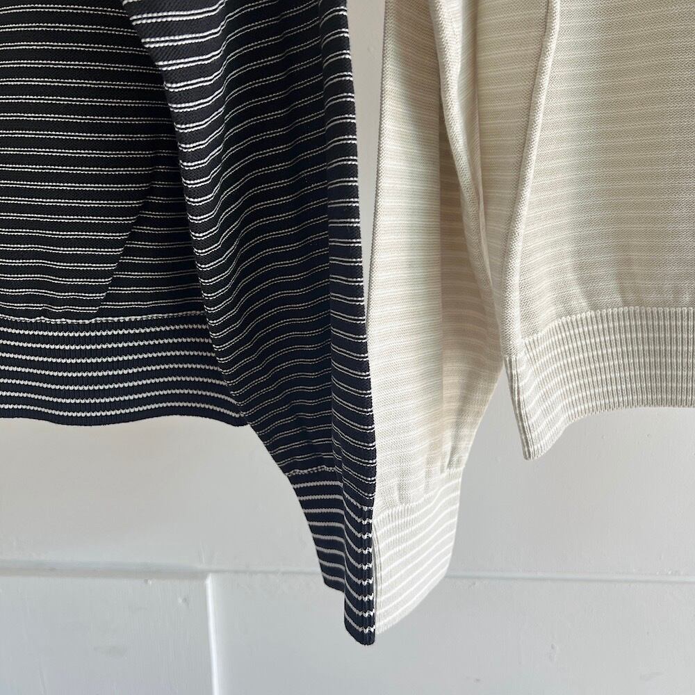 機械編み 12G のハイゲージを 天竺編みで細ピッチのボーダーで組み、裏目を表側にすることで、ボーダーの見え方が変わって見える様にしています。