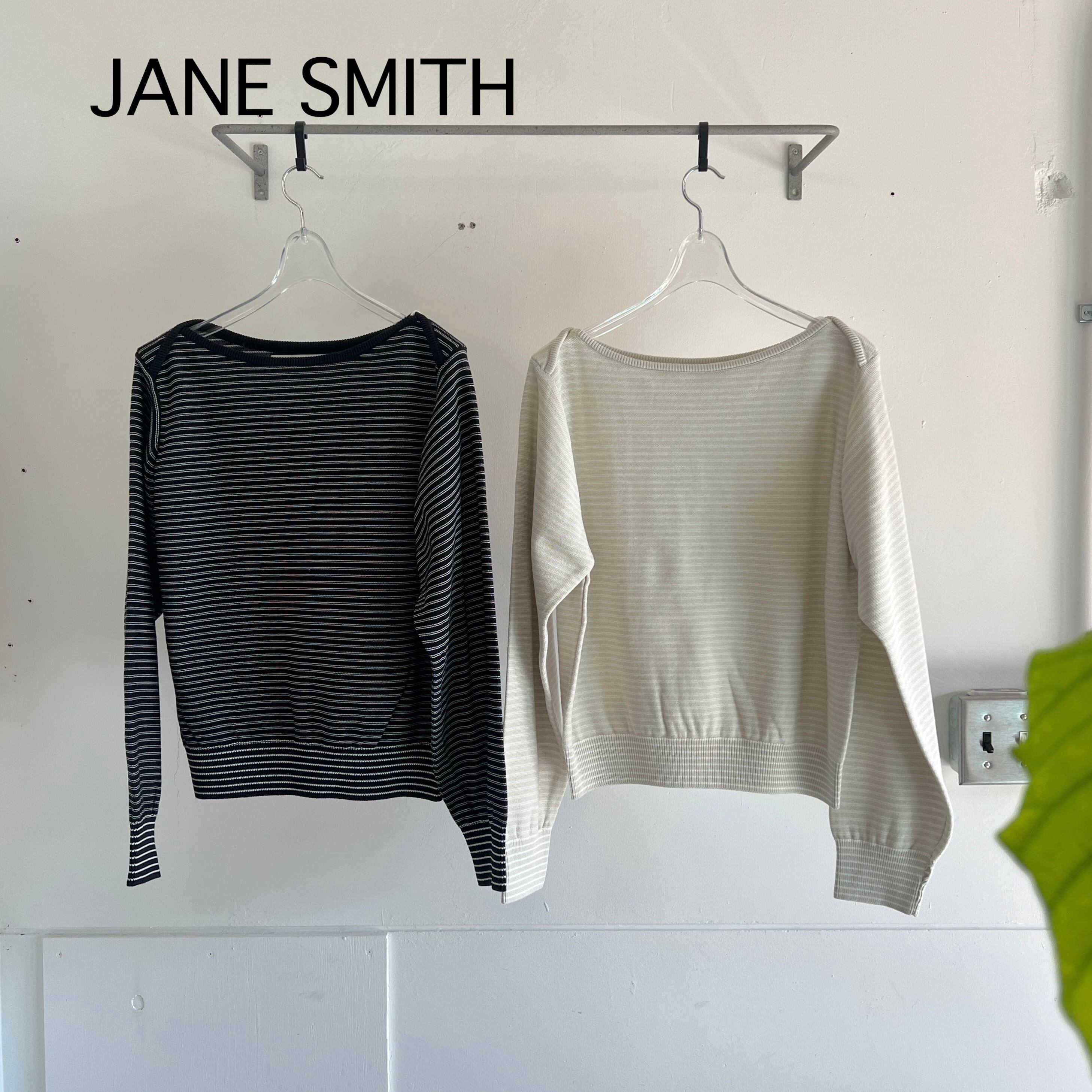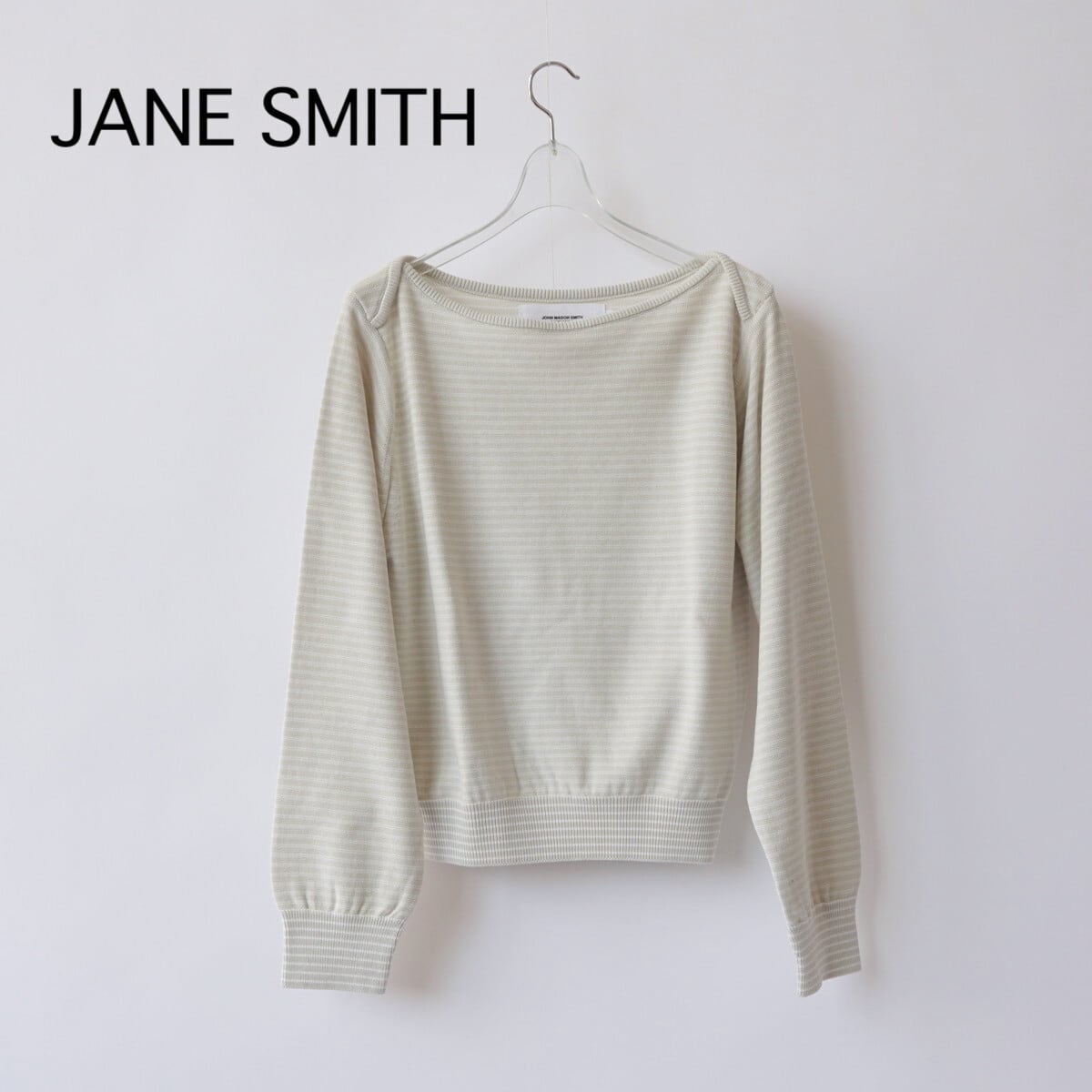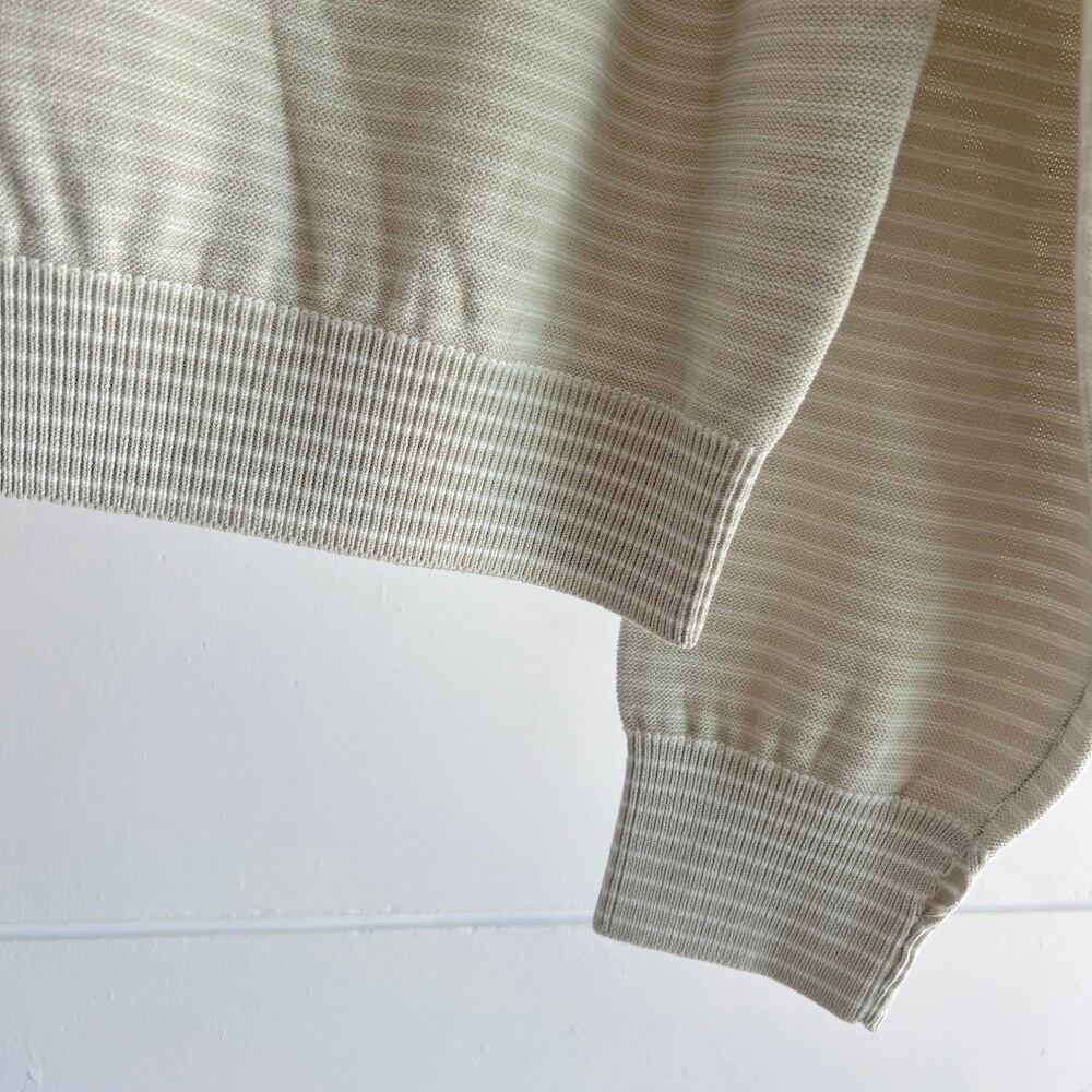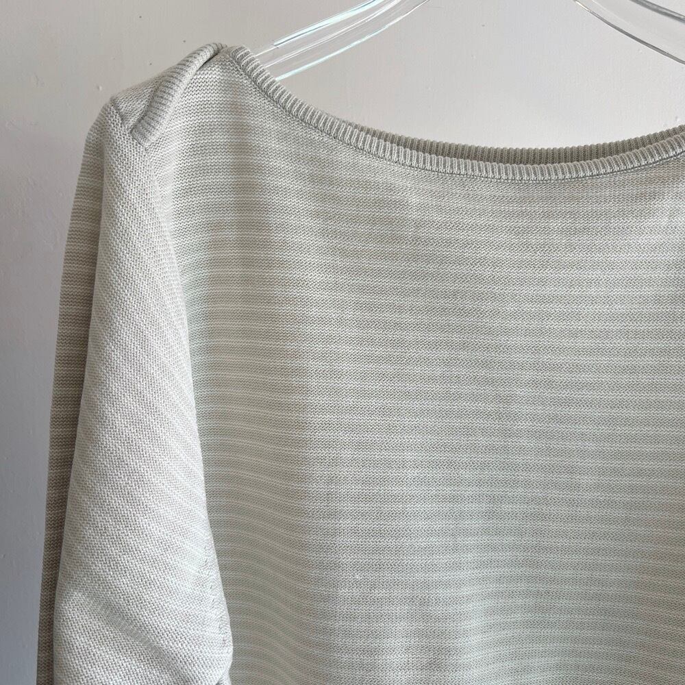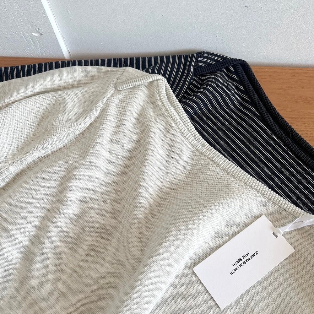 機械編み 12G のハイゲージを 天竺編みで細ピッチのボーダーで組み、裏目を表側にすることで、ボーダーの見え方が変わって見える様にしています。