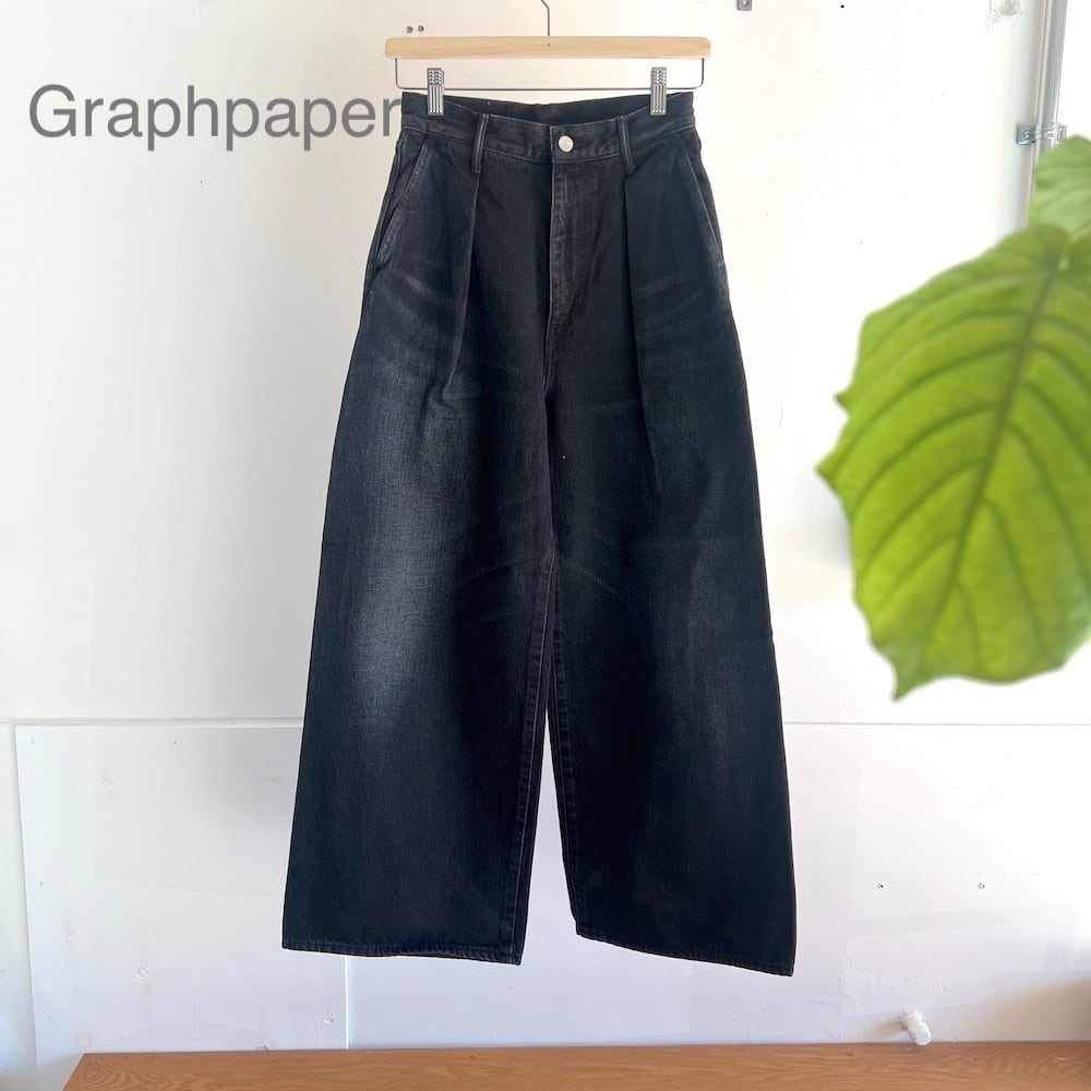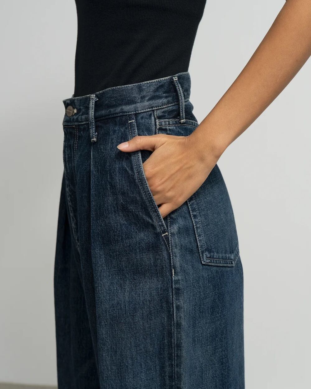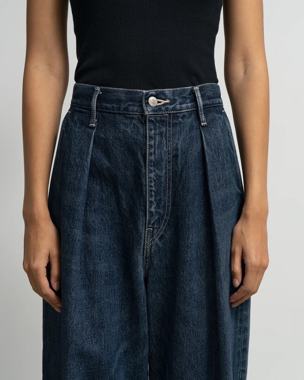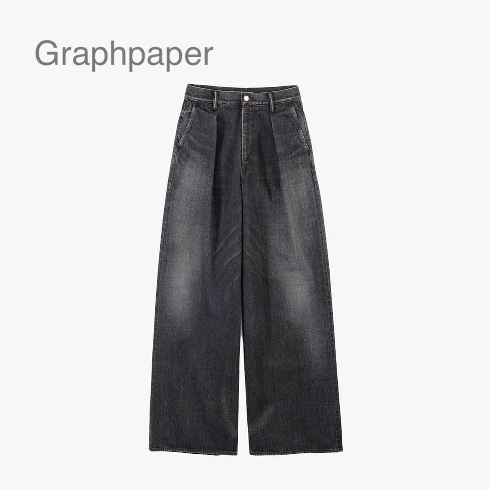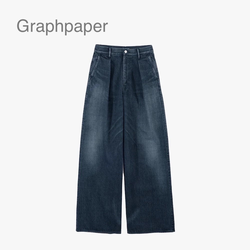 腰周りをスッキリと見せるハイウエストに、裾に向かってまっすぐ落ちる深めのタックが上品な印象を与えるハイウエスト設計のワイドストレートデニム。