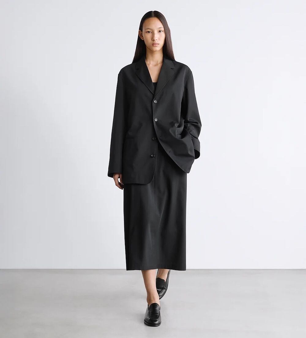 パンツと同じ前開き仕様で、まっすぐに落ちる端正なボックスシルエットが洗練された印象を演出します。
