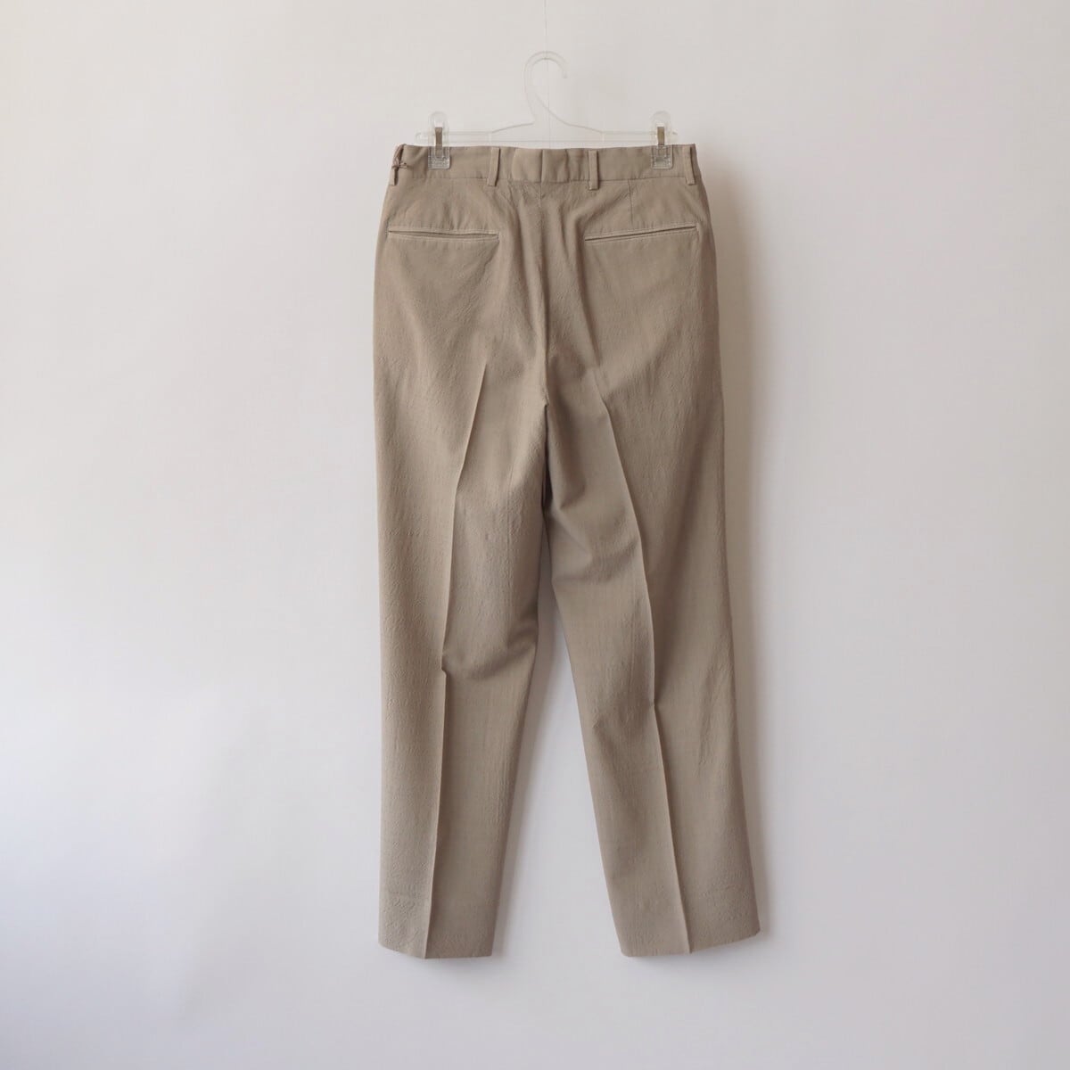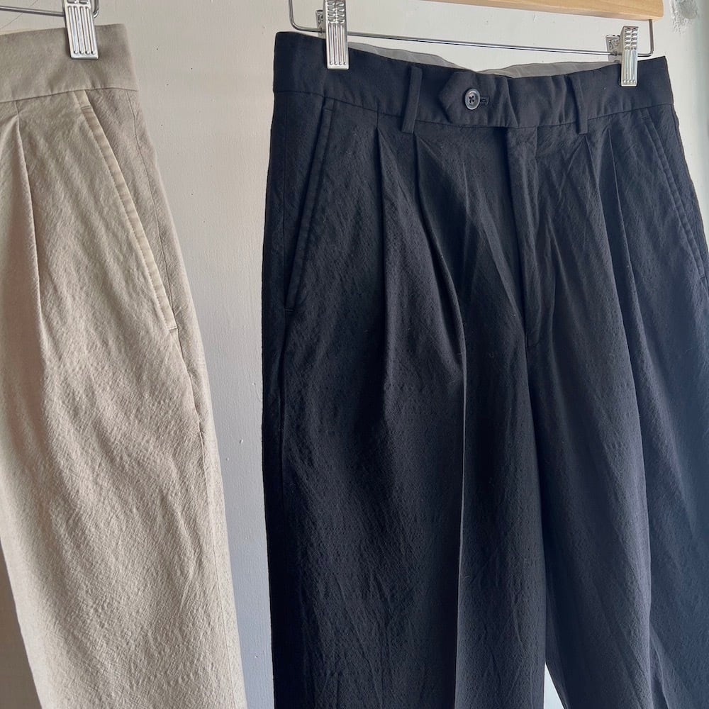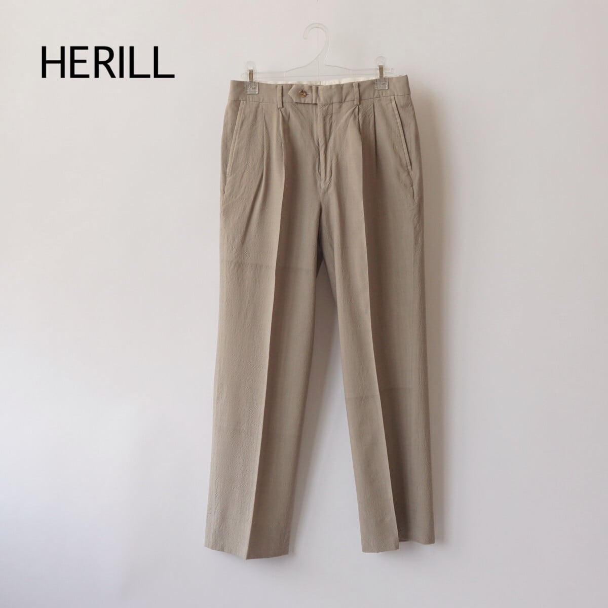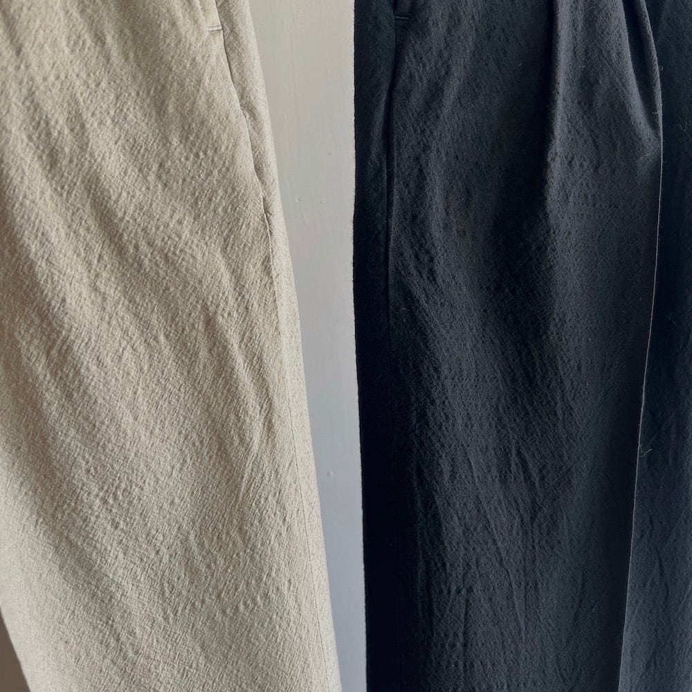 ウールトロピカルのさらっと軽やかな生地感と柔らストレッチ性を感じるで楽な穿き心地、きれいな作りながらラフに夏まで着用できるHERILLらしいトラウザーです。