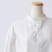 オーセンティックな印象もありながら、白の厚薄でテープ状に見えるストライプが特徴の素材を使用しさりげない光沢感と透け感のコントラストが美しい、衿が細目のバンドカラーのシャツです。