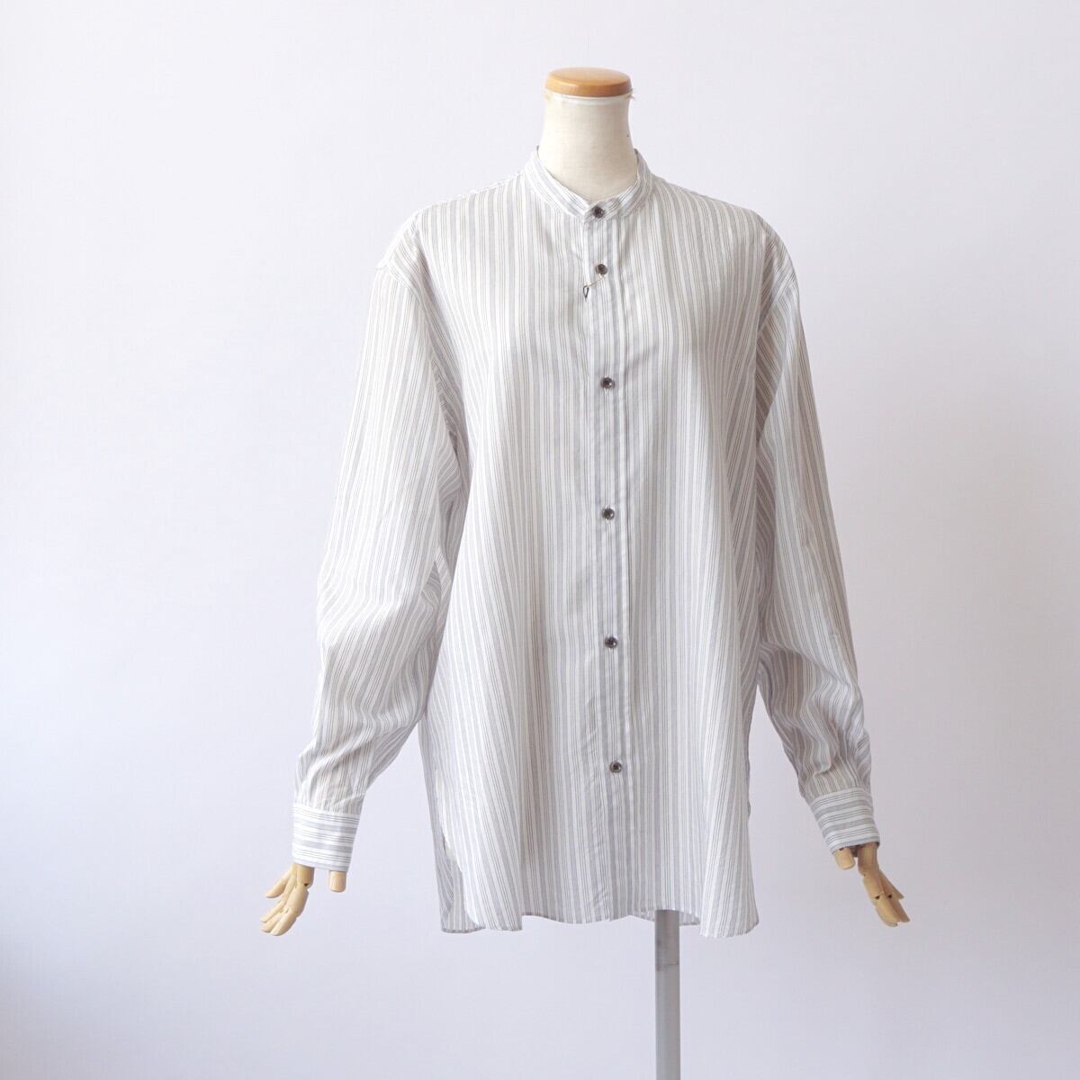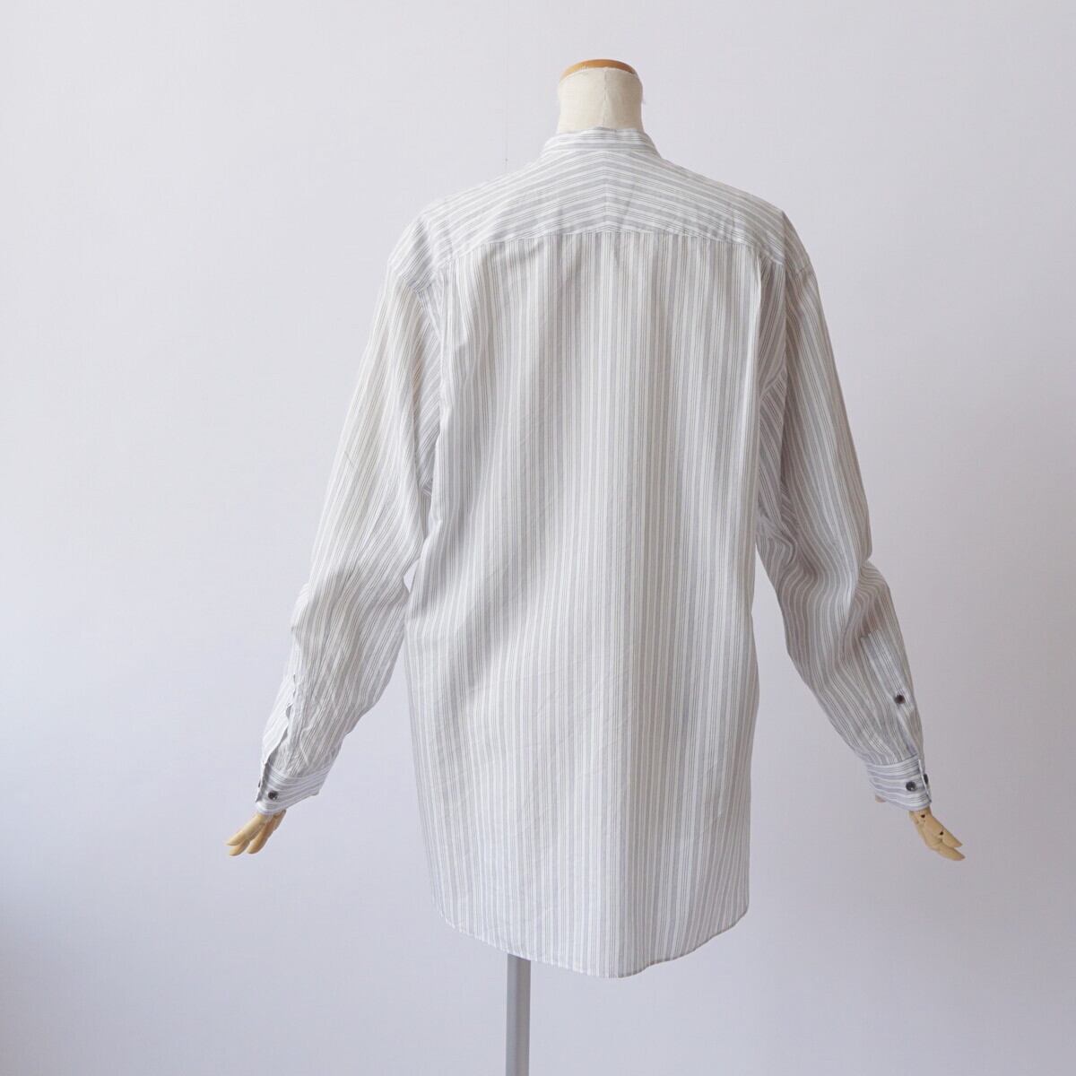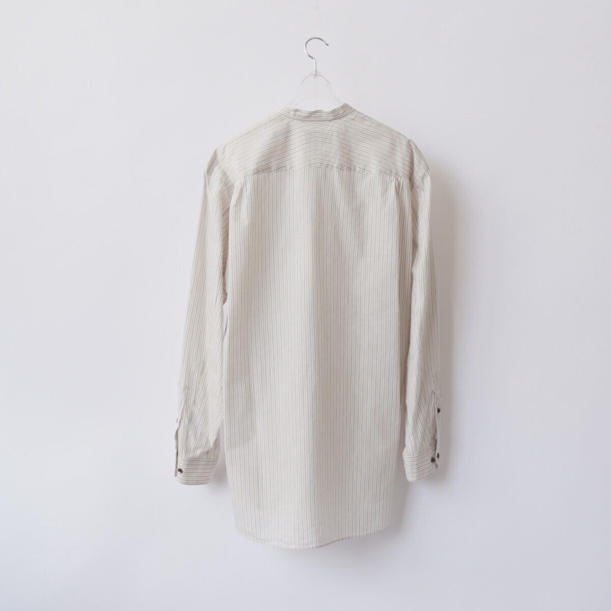 衿が細目のバンドカラーシャツ。