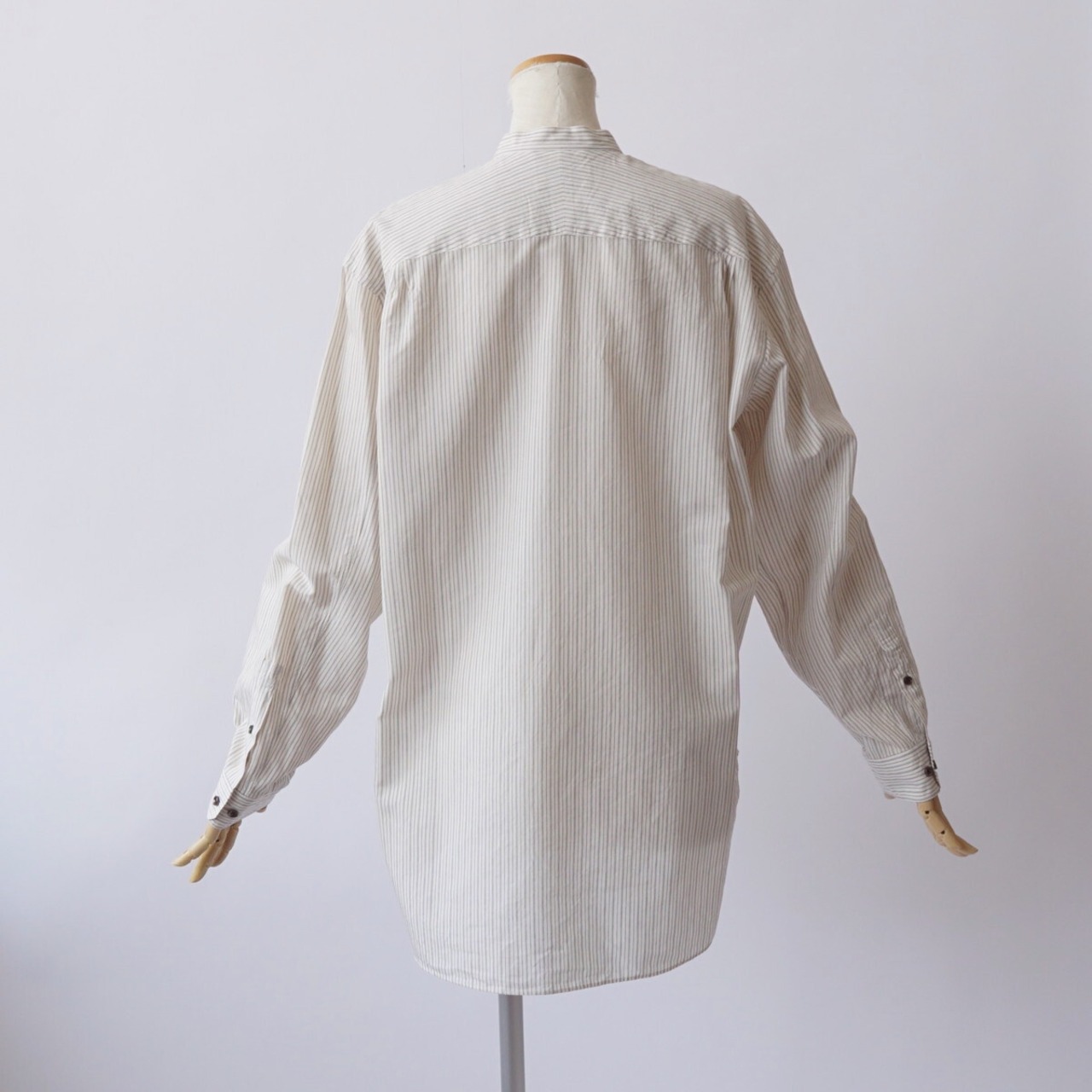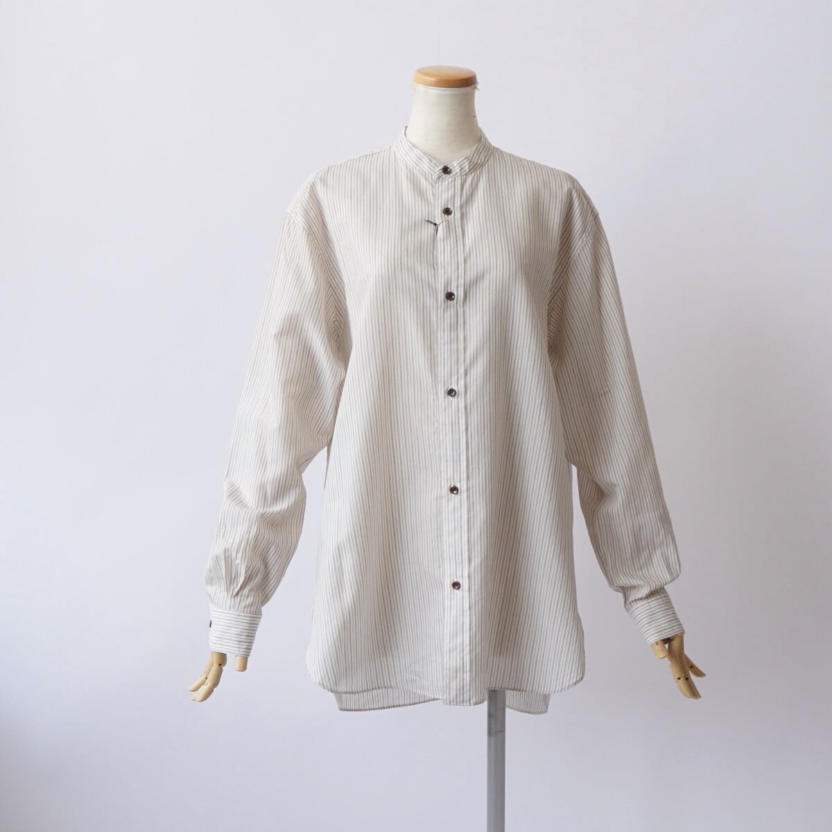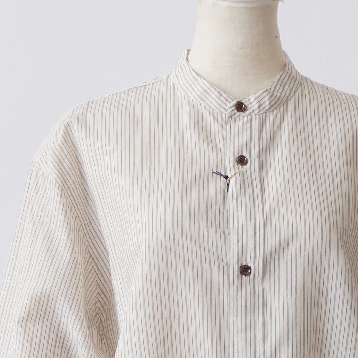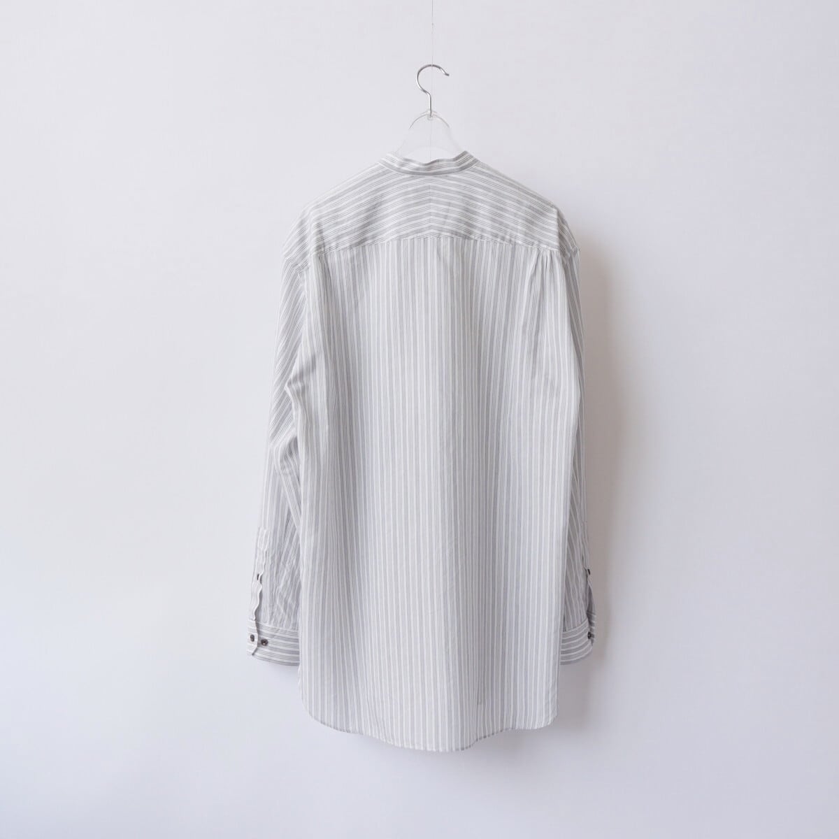 衿が細目のバンドカラーシャツ。