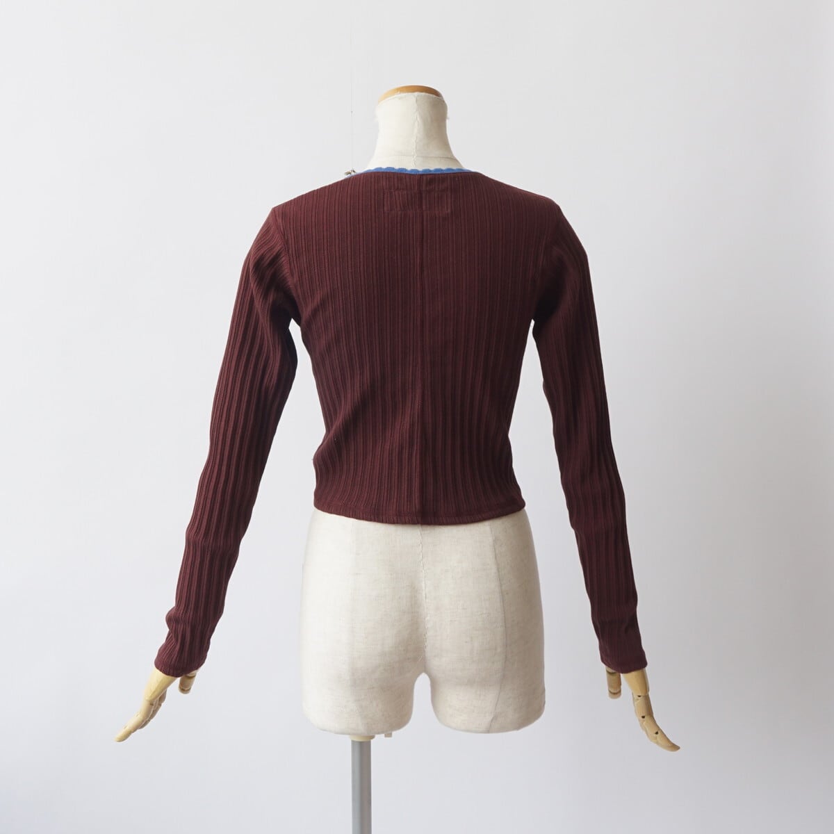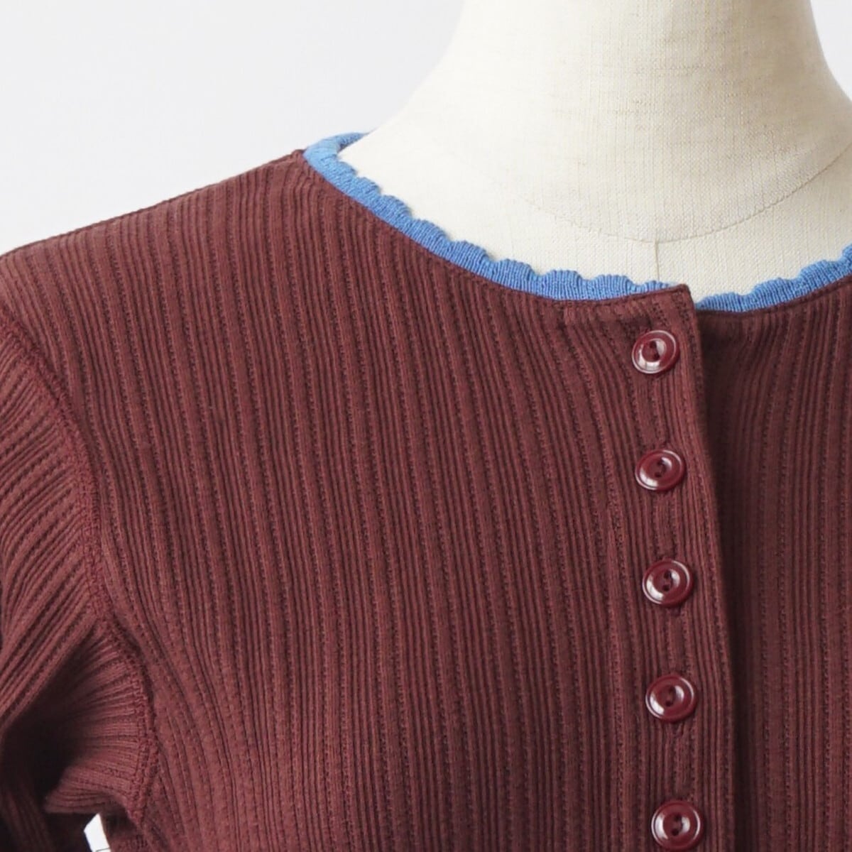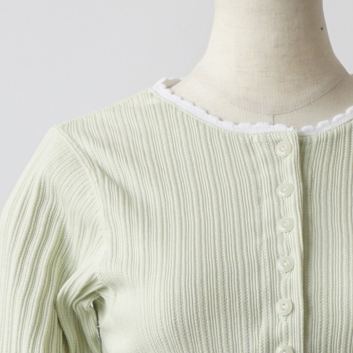 ボタンの多用使いと、襟ぐりに横付属で編んだなみなみのピコレースを施したデザインが特徴のクルーネックカーディガンです。
