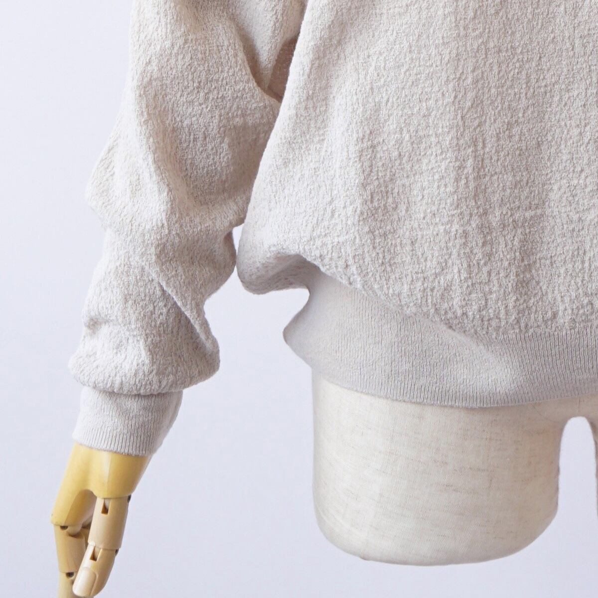 スヴィンコットンを特殊紡績で強撚に仕立て、さらに撚糸を加える事で布帛の楊柳生地の様な独特な表情を表現しています。